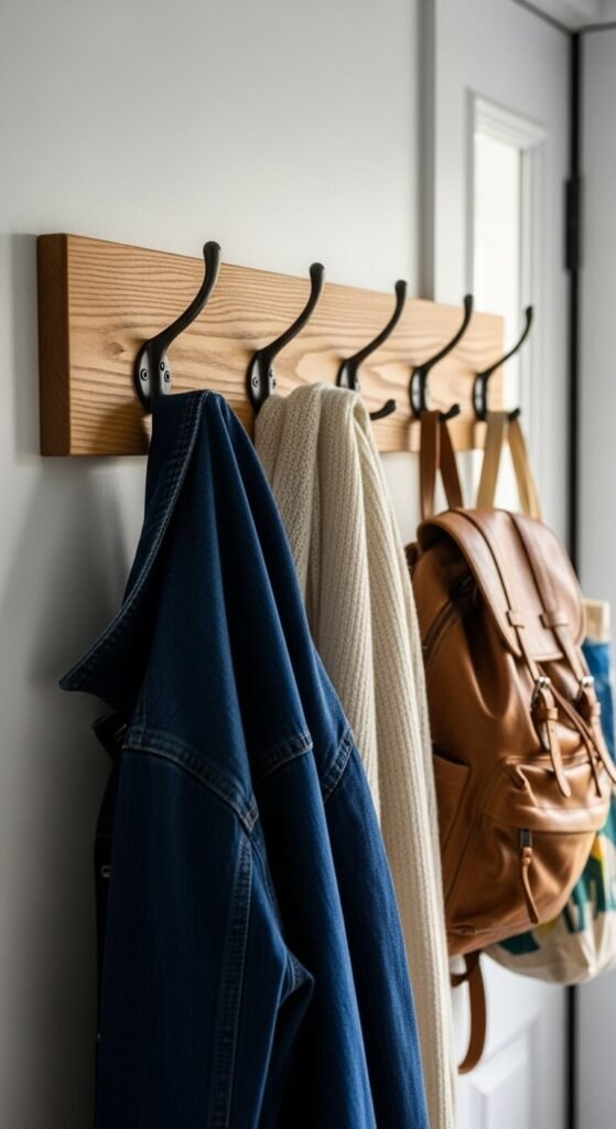 Paint wooden pegs to match your walls or leave them natural. Add labels underneath for younger children. This keeps coats off furniture and floors without taking up precious floor space.