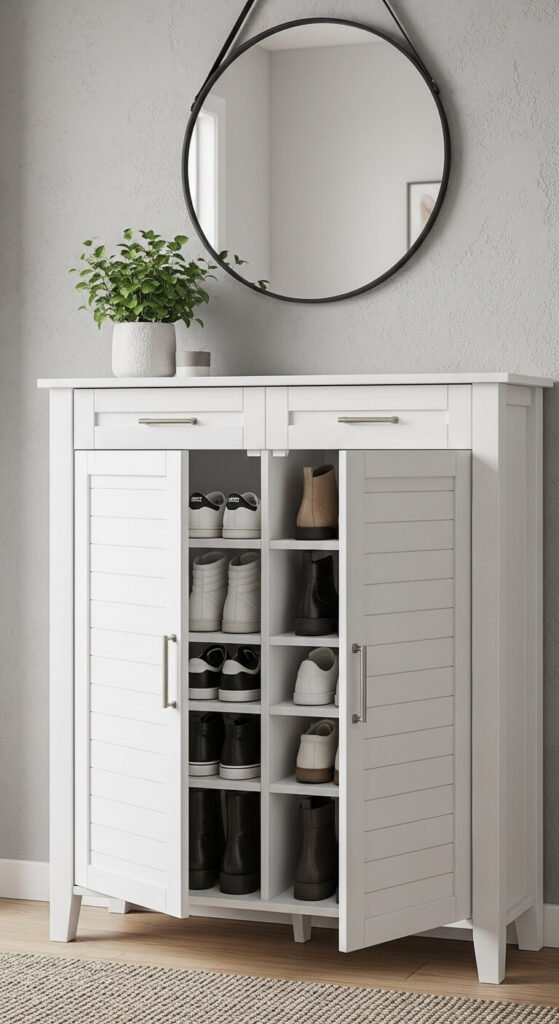 Hide shoe clutter behind cabinet doors while keeping everything accessible. Look for units with adjustable shelves that fit boots and sneakers.