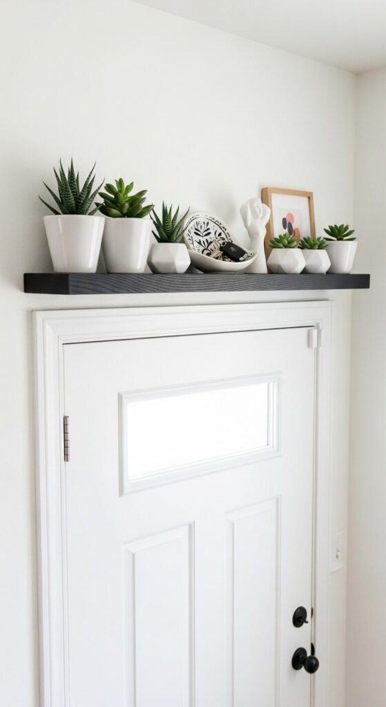 Keep a bowl for loose change, a small plant, or seasonal decorations. The shelf should be 6 to 8 inches deep and match your door frame width.