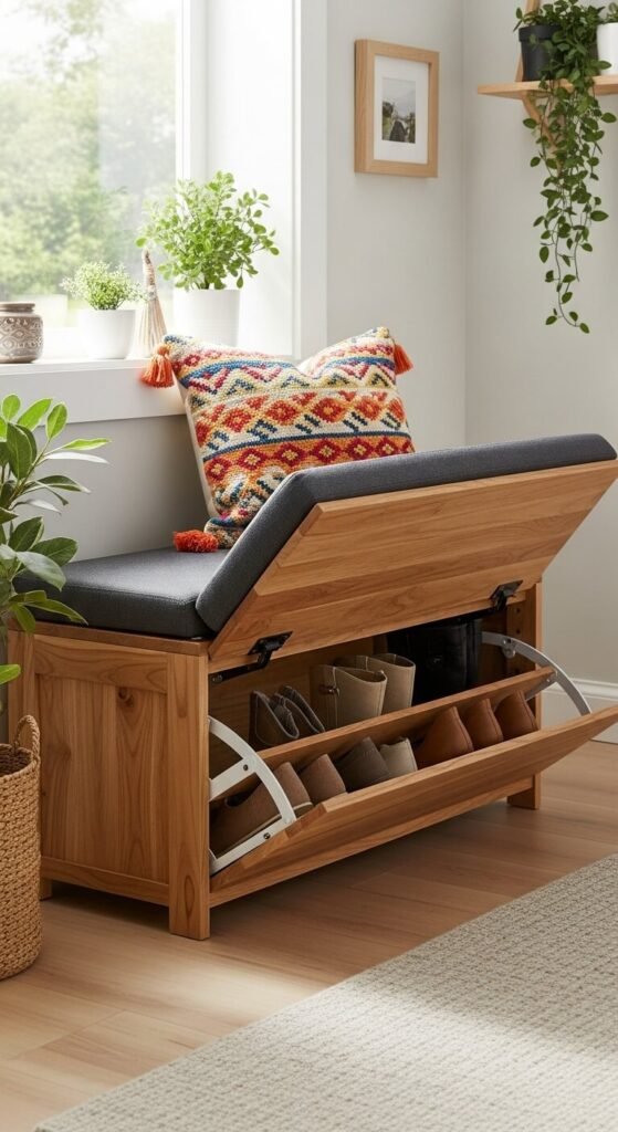 Add washable cushions on top for comfort. Store off-season shoes inside and keep daily pairs underneath in a separate tray. Check garage sales for solid wood benches you can refinish yourself. Sand and stain for under $40 total.