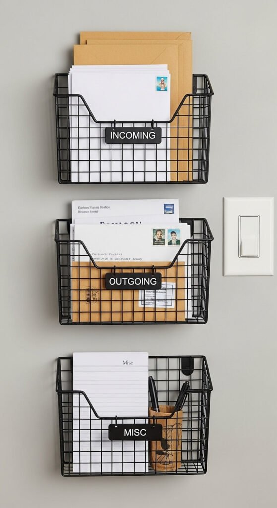 Use wire baskets, hanging file folders, or repurposed magazine holders. Mount them at eye level so you actually use them.