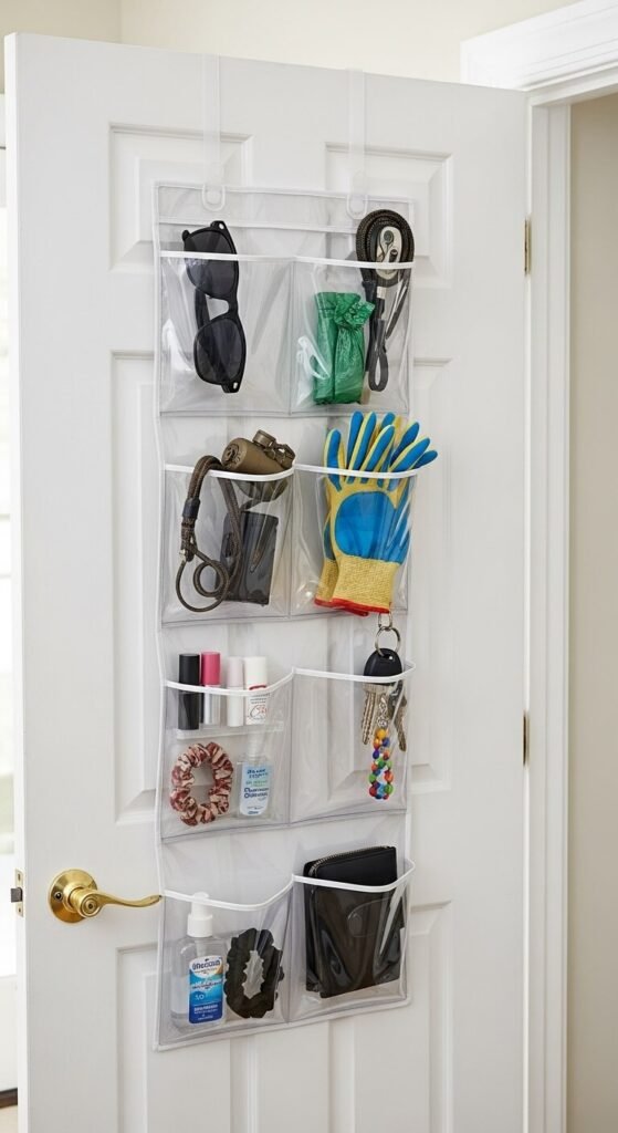 Heavier items go in bottom pockets to prevent sagging. Pet supplies like leashes and waste bags fit perfectly here too. Shake out the organizer monthly to remove dust. These run $10 to $25 depending on size.