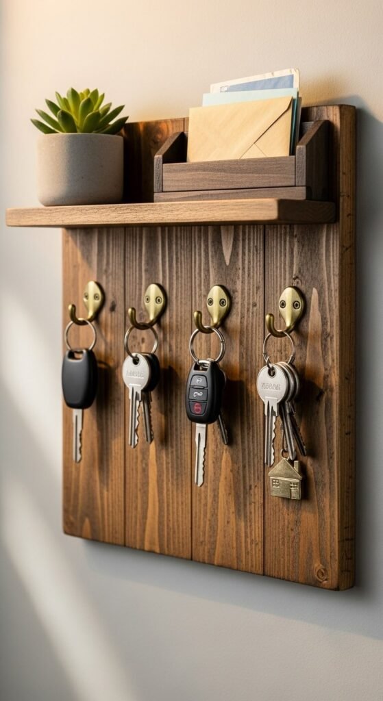 Label each hook with family member names or key types (car, house, garage). Add a small shelf above for wallets and phones. Use chalkboard paint on the board to leave quick notes. Total DIY cost is around $12.