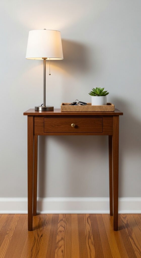 Measure your doorway clearance before buying. You should have at least 36 inches of walking space remaining. Thrift stores often have console tables for $30 to $60. Paint or refinish to match your style. Add a mirror above to check yourself before leaving.