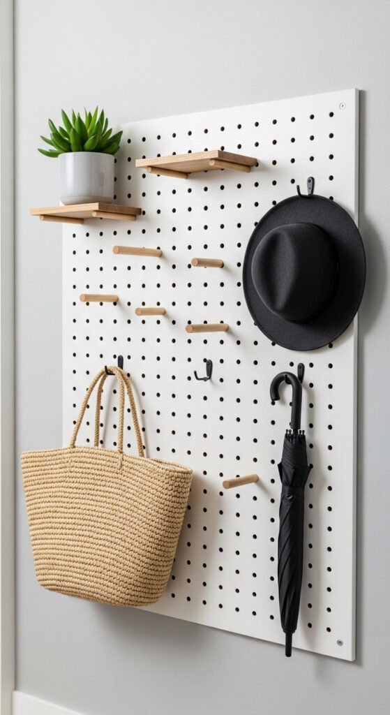 Paint pegboard to match your entryway or leave it natural. Add hooks for bags, small shelves for phones, and baskets for accessories.