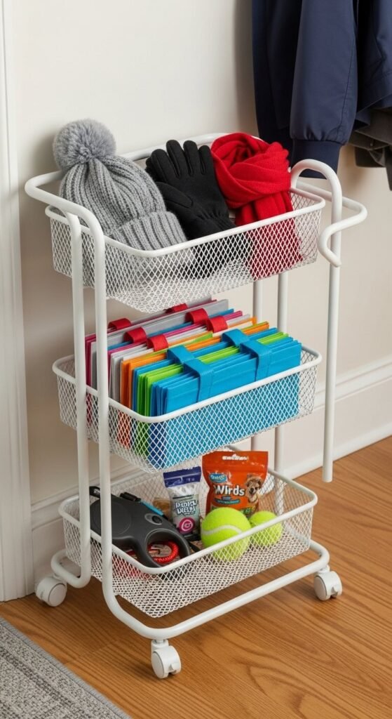 Keep a small rolling cart in your entry closet or beside the door. Swap out seasonal items without permanent installation.