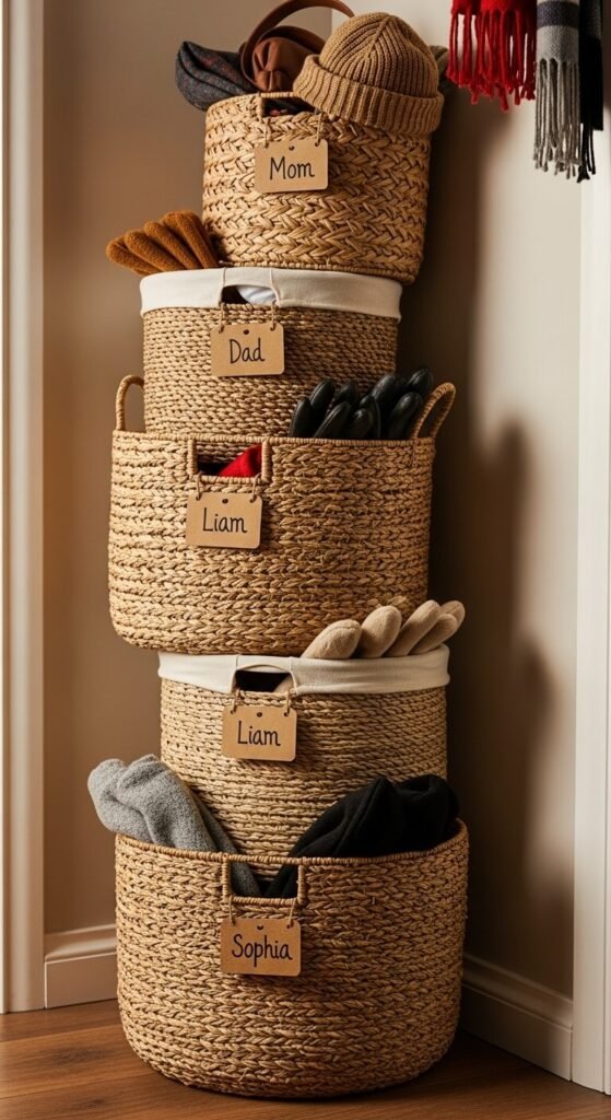 Kids load their own baskets with library books, sports gear, or school projects. Adults use them for work bags or hobby supplies. This prevents the “I can’t find my…” conversations. Label baskets with names or colors. Woven baskets cost $5 to $15 each at discount stores.