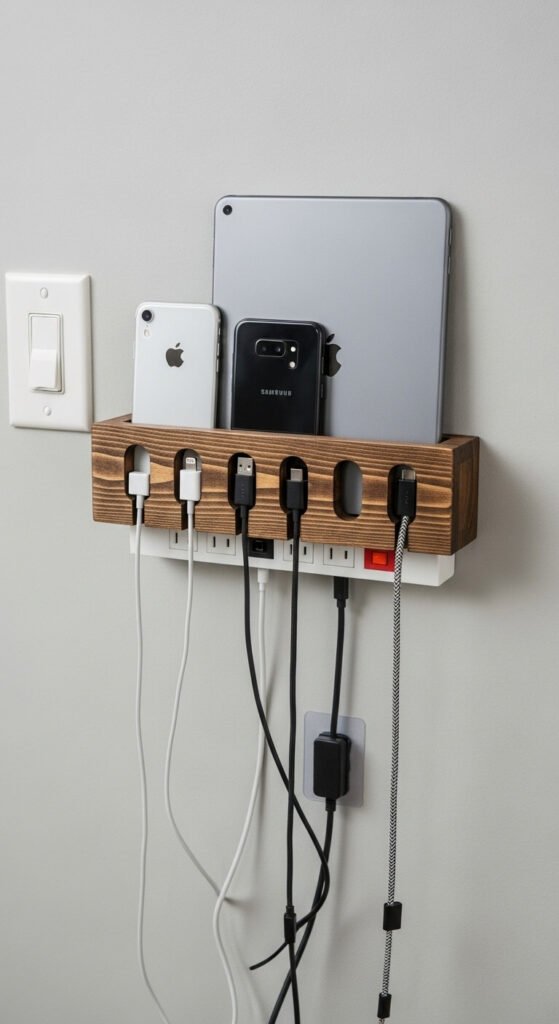 Charge devices overnight in the entryway instead of bedrooms. This reduces screen time before bed too. Keep the power strip surge-protected. Add small dividers to prevent phones from sliding. Build this for $20 with a basic shelf and adhesive cable clips.