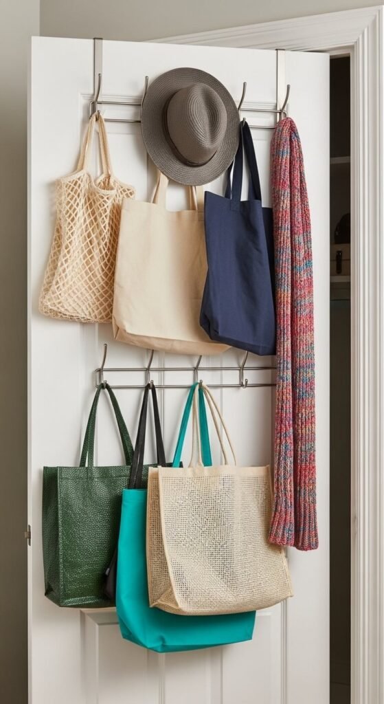 Install command hooks or permanent hooks based on weight capacity. Hang reusable bags, lightweight jackets, or scarves.