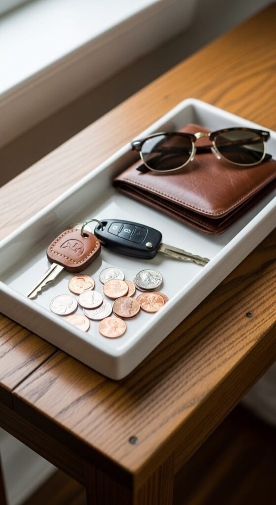 Empty pockets in the same spot every day. A simple tray prevents keys, change, and receipts from scattering.