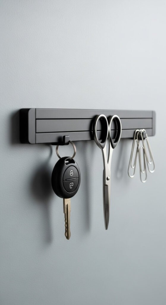 The strip keeps metal items visible and accessible. Keys won’t fall behind furniture or get buried in drawers.
