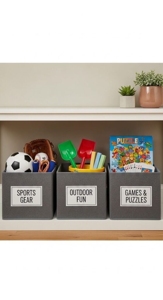 Rotate bins seasonally. Winter bins hold sleds and snow toys. Summer bins hold beach gear. This teaches kids to put things away correctly. Dollar store bins work fine for $3 each. Print labels for free at home.