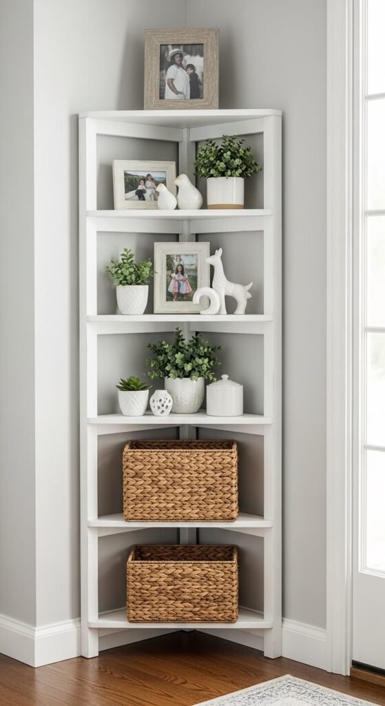 Corners go unused in most entryways. A corner shelf tower captures that wasted space without blocking traffic flow.