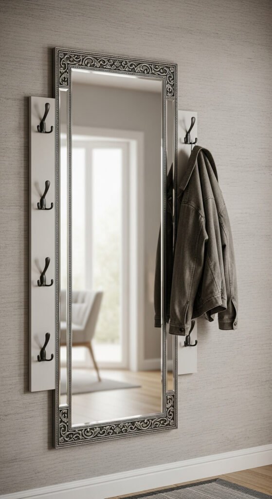 Full-length mirrors work best for outfit checks before leaving. Hooks along the sides or bottom hold coats and bags.