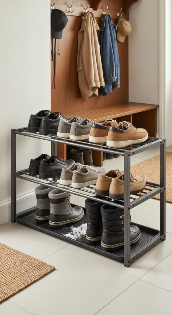 Choose racks with slatted shelves so air circulates. Add a boot tray on the bottom tier for snow boots or rain shoes.