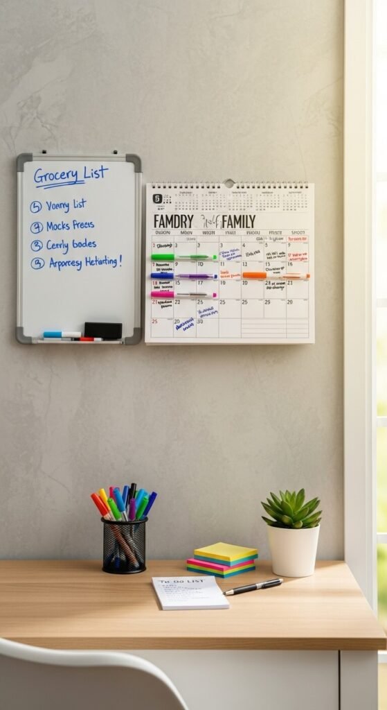 Add a small dry-erase board for grocery lists and quick notes. Keep pens in a cup that’s attached or weighted so they don’t walk away.