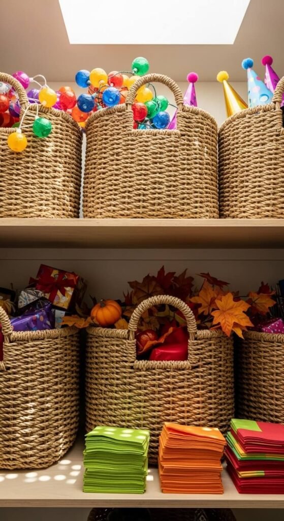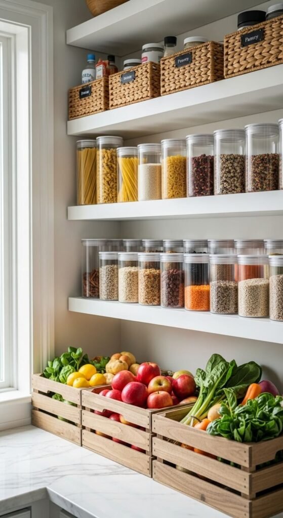 Top shelves are hard to reach but perfect for items you don’t use daily. Store seasonal baking supplies, party napkins, special occasion serving dishes, or bulk overflow here. Use baskets with handles so you can pull them down easily when needed. Label the front of each basket so you know what’s inside without climbing. This keeps everyday items at eye level while maximizing vertical space. Consider a small step stool nearby for safe access. Lightweight plastic bins work better than heavy ceramic containers for these heights.