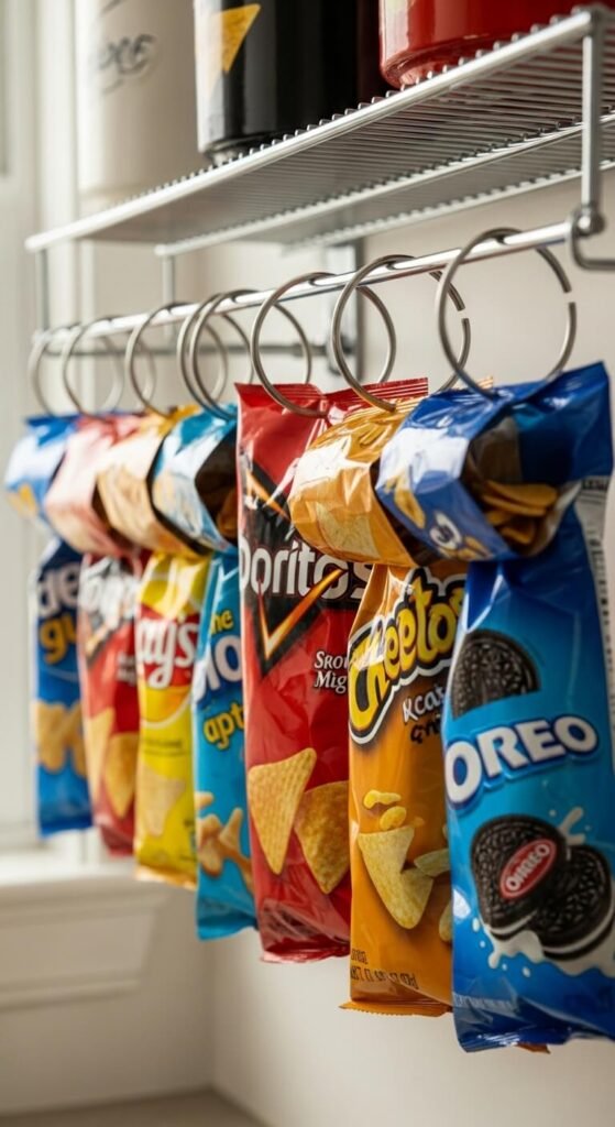 Open chip bags stay fresh longer when you fold the top down and clip them with shower curtain rings hung from a pantry rod or wire shelf. This keeps bags from toppling over and taking up shelf space. The rings cost pennies and you can hang a dozen bags in the space of one shelf. Kids can see all snack options at once and grab what they want. This works for any bag—pretzels, popcorn, cookies. Remove air from bags before clipping to extend freshness and save space.