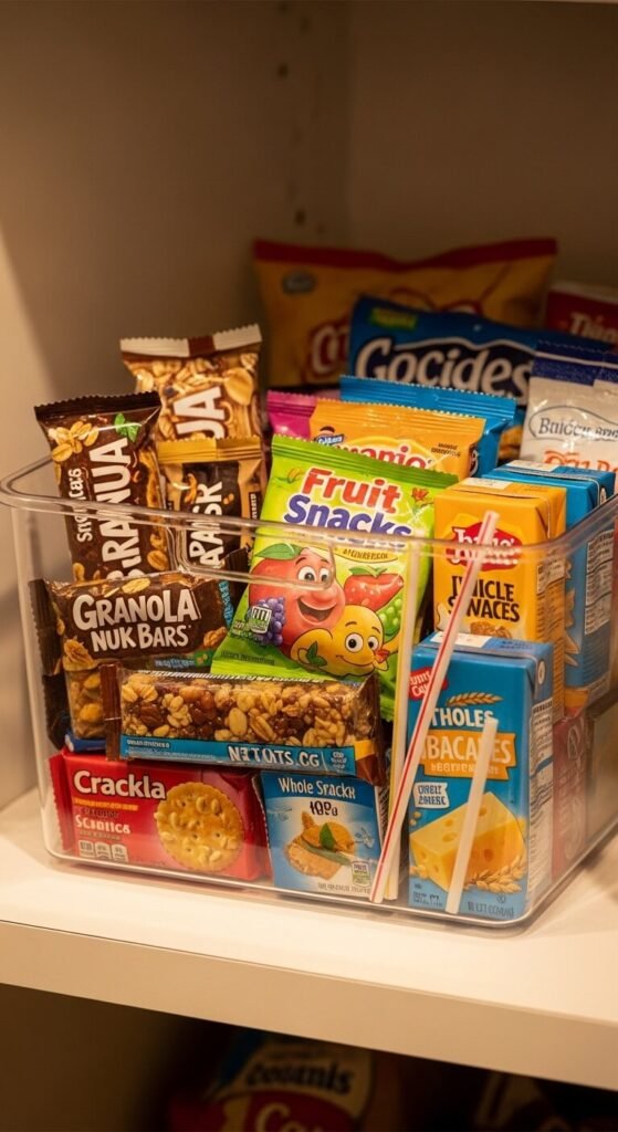 Designate one low bin or basket as the official snack zone where kids can help themselves. Fill it with pre-approved, individually wrapped snacks. This reduces constant requests for snacks and teaches independence. Choose a clear bin so kids can see options without dumping everything out. Refill it weekly during meal prep. This also helps with portion control since items are pre-packaged. Place it at kid height so they can reach without climbing. Rotate snack varieties to prevent boredom and reduce waste.
