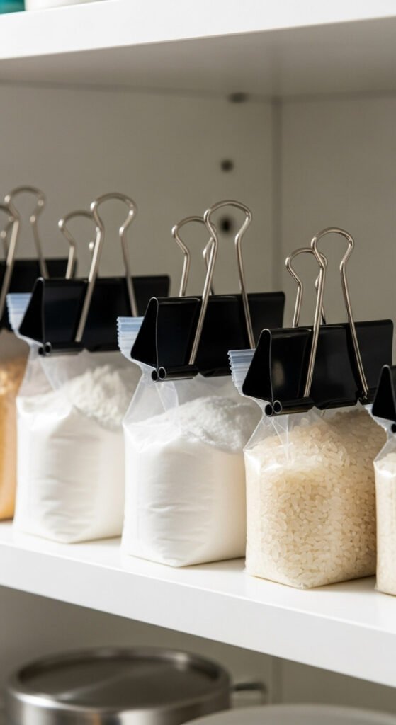 Binder clips seal opened bags better than twist ties and take up less space than chip clips. Fold the bag top down twice and secure with a medium or large binder clip. This keeps contents fresh and prevents spills. The metal handles let you hang bags from hooks or rods if you want them off shelves. Remove the metal handles to use clips as regular closures. You probably have binder clips in a desk drawer already—free storage solution. Works for coffee, flour, sugar, rice, beans, and pet food.