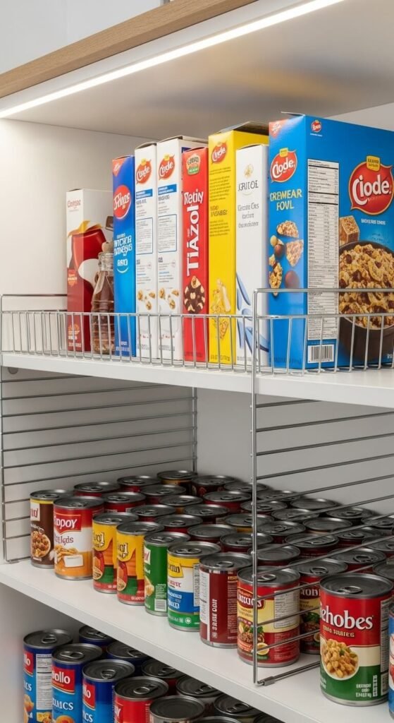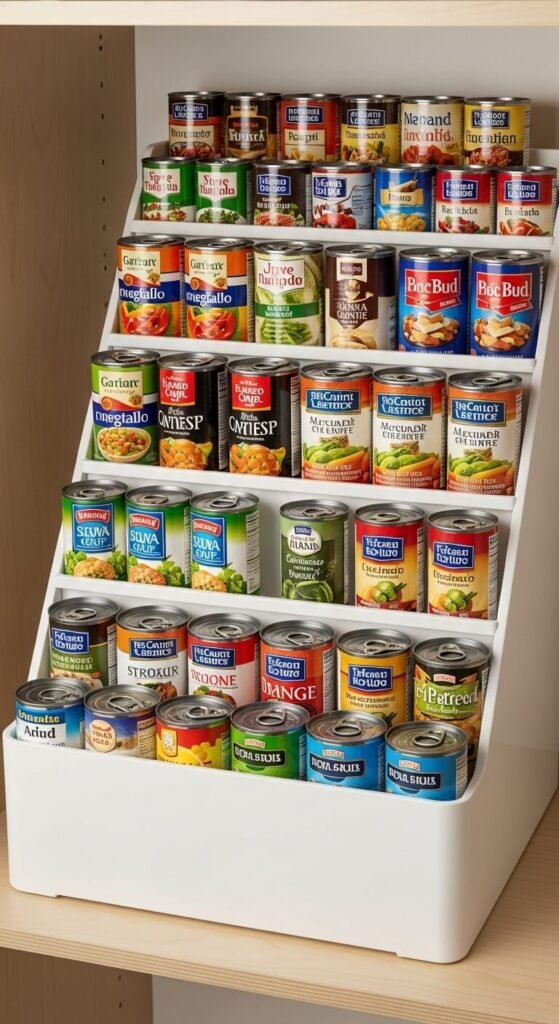 Can organizers create slanted shelves that let you see every label while automatically rotating stock. Load new cans in the back and grab from the front—first in, first out. This prevents cans from expiring in the back of shelves. You can buy plastic or metal can organizers that hold 12 to 36 cans for around 15 dollars. Or make your own with cardboard and duct tape by creating angled platforms. These work in cabinets too. Group cans by type—vegetables, soups, beans—for faster meal planning.