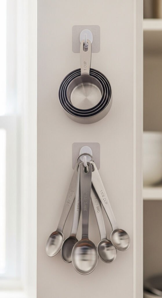 Stop digging through drawers for measuring tools. Hang them inside your pantry door or on the wall where you store baking supplies. Use small adhesive hooks or a mounted rack. This puts them exactly where you need them and saves drawer space. Keep both dry measuring cups and liquid measuring cups here along with measuring spoons. You’ll speed up baking and reduce kitchen traffic. Clean and hang them immediately after use so they’re always ready. This works for whisks and other frequently used tools too.