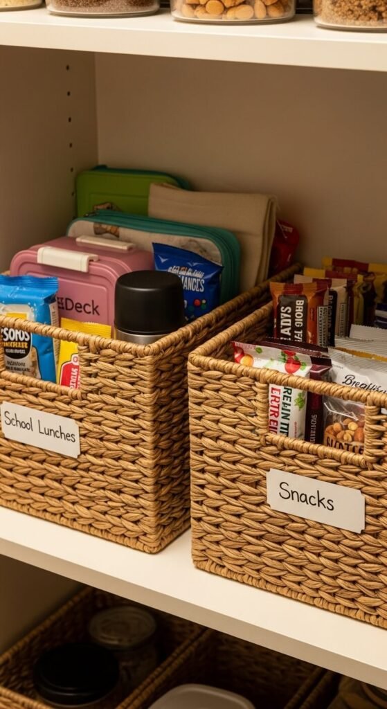Corralling related items in baskets creates portable kits you can grab and go. Make a school lunch basket with juice boxes, snack packs, and napkins. Create a breakfast basket with instant oatmeal, granola bars, and coffee pods. When it’s time to pack lunches, carry the whole basket to the counter instead of making multiple trips. Woven baskets add texture and warmth while plastic bins are easier to clean. Label each basket clearly on the front. This system works brilliantly for camping supplies, baking ingredients, or baby food.