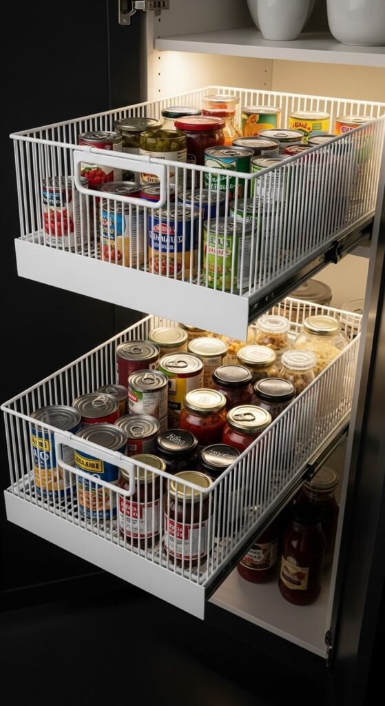 Deep shelves hide items in the back where they’re forgotten until they expire. Pull-out drawers solve this by bringing everything forward with one motion. You can install wire baskets or plastic drawer inserts yourself with basic tools. They cost 20 to 40 dollars depending on size. Measure your cabinet width and depth before buying. These work great for heavy items like canned goods or small items like spice jars. Once installed, you’ll wonder how you managed without them. Check weight ratings if storing heavy items.