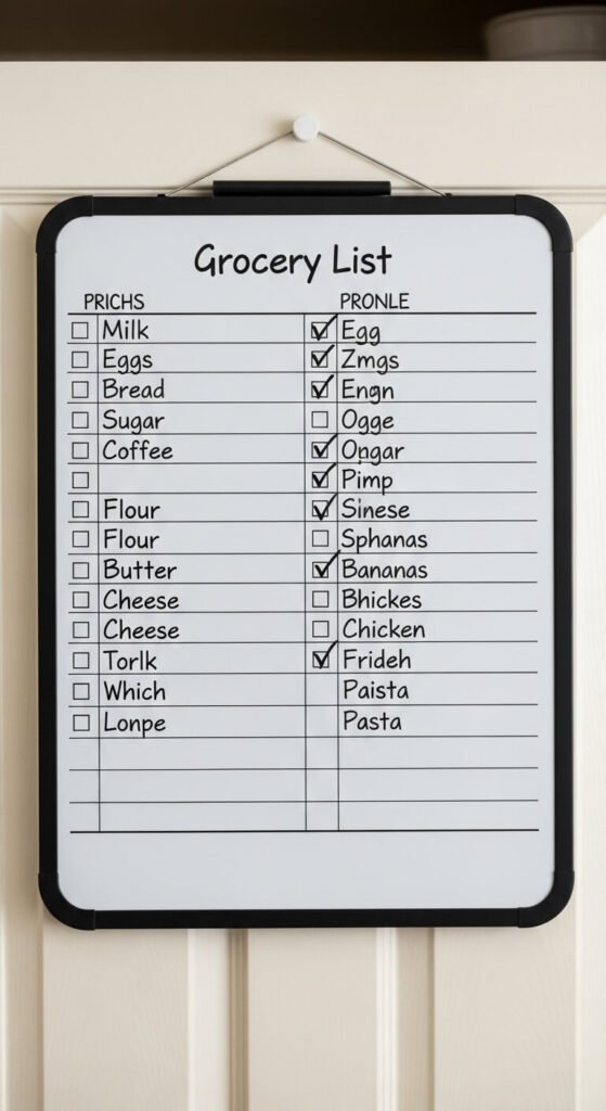 Mount a small whiteboard or chalkboard inside your pantry door for noting items as you run out. This prevents duplicate purchases and ensures you remember everything at the store. Keep a marker or chalk attached with a string so it’s always there. Family members can add items throughout the week. Take a photo of the list before shopping so you don’t forget the list itself. This simple system costs under ten dollars and saves hundreds in prevented waste and duplicate buying over the course of a year.