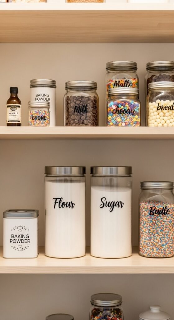 Collect all baking items in one dedicated area—flour, sugar, baking powder, baking soda, vanilla, chocolate chips, sprinkles. This makes baking projects faster since you’re not hunting for ingredients. Use a basket or bin to keep smaller items together. Store measuring cups here too for one-stop shopping. This prevents buying duplicates because you can see your inventory at a glance. Consider a separate small container for decorating supplies like food coloring and cake toppers. Review this zone before holidays when baking ramps up to restock essentials.