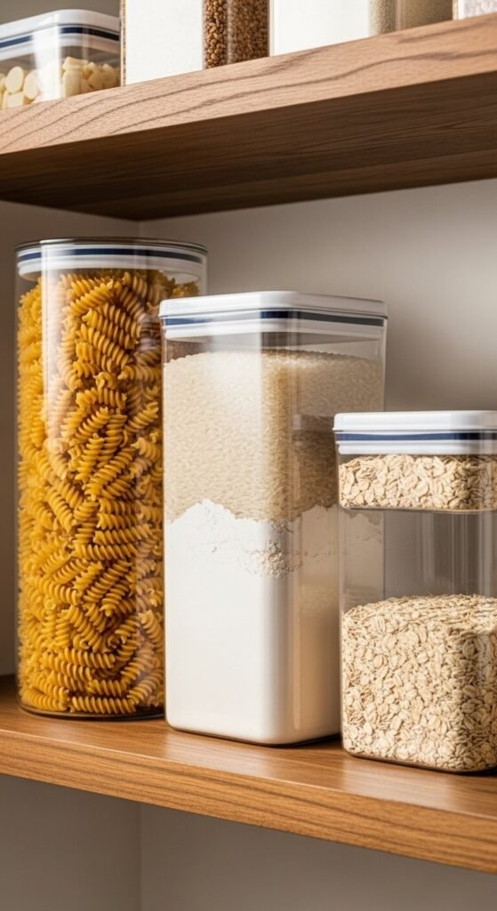 Transferring dry goods into clear containers lets you see exactly what you have at a glance. No more guessing if that bag has enough flour for your recipe. Choose stackable square or rectangular containers to maximize shelf space—round ones waste corners. Label each container with a permanent marker or adhesive labels. You can find affordable container sets at dollar stores or reuse glass jars from pasta sauce and pickles. This simple switch prevents buying duplicates and keeps food fresher longer since airtight seals protect against moisture and pests.