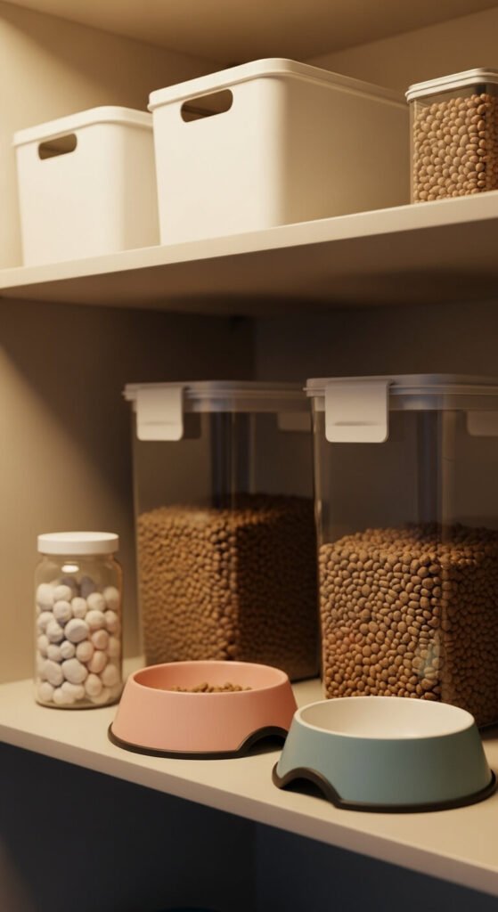 Keep pet food, treats, and supplies in their own pantry zone to prevent contamination with human food and make feeding time faster. Transfer kibble to airtight containers to maintain freshness and prevent odors. Store treats, supplements, and feeding accessories in labeled bins. This prevents accidentally using pet spoons for cooking or mixing up storage containers. Place this zone on a lower shelf for easy access during morning and evening feedings. Keep scoops inside containers for portion control. This organization also helps pet sitters find everything they need quickly.
