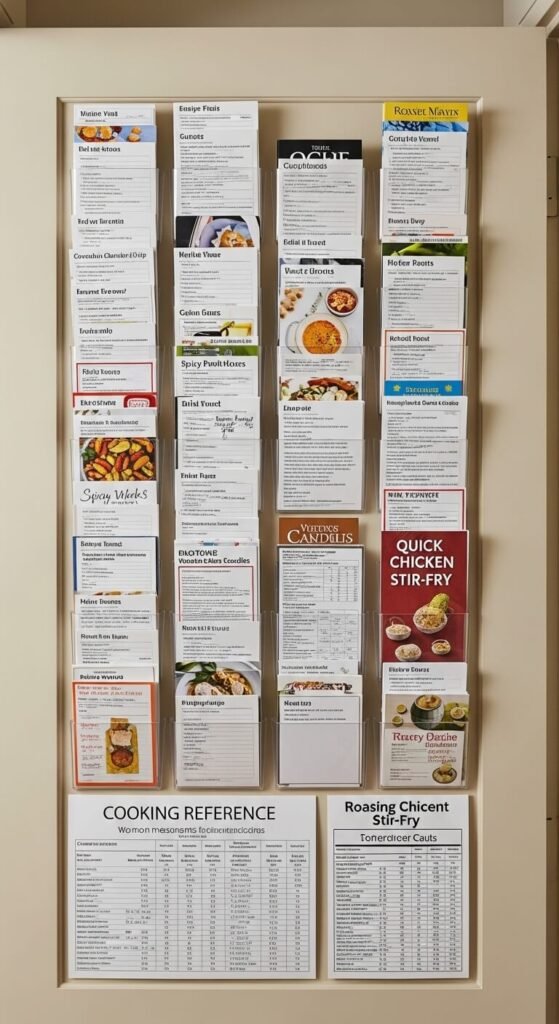 Mount clear plastic pockets on your pantry door to hold frequently used recipe cards, cooking conversion charts, or meal planning calendars. This puts recipes right where you need them when grabbing ingredients. You can find adhesive-backed plastic pockets at office supply stores for under five dollars. Rotate recipes seasonally or keep family favorites permanently displayed. This beats searching through recipe boxes or scrolling on sticky phone screens while cooking. Include emergency substitution charts for when you’re missing an ingredient. Wipe pockets clean monthly to remove cooking splatter.
