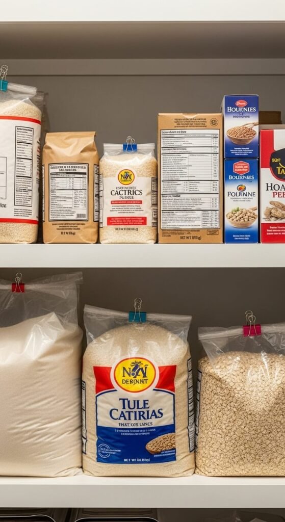 When buying bulk items from warehouse stores, you don’t always need to transfer contents to containers. Large bags of rice, beans, or flour can stay in original packaging if you fold the tops down and secure with heavy-duty clips. This saves time and container costs. Store these larger items on bottom shelves where their weight won’t damage lighter foods. Cut open one corner to pour from rather than fighting with the entire top. Keep a scoop inside the bag for easy portioning. Only transfer to containers if original packaging is damaged or awkward to handle.