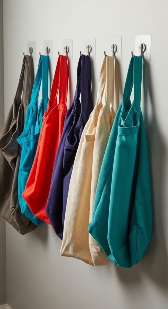 Reusable shopping bags need a home or they end up scattered throughout the house. Install adhesive hooks on the side wall of your pantry or on the door to hang them. This keeps bags ready for your next shopping trip and prevents the plastic bag collection from taking over. Fold bags neatly before hanging for a tidy appearance. Sort by size if you have both small and large bags. This visual reminder also helps you remember to actually bring bags to the store. Keep one or two in your car permanently as backup.