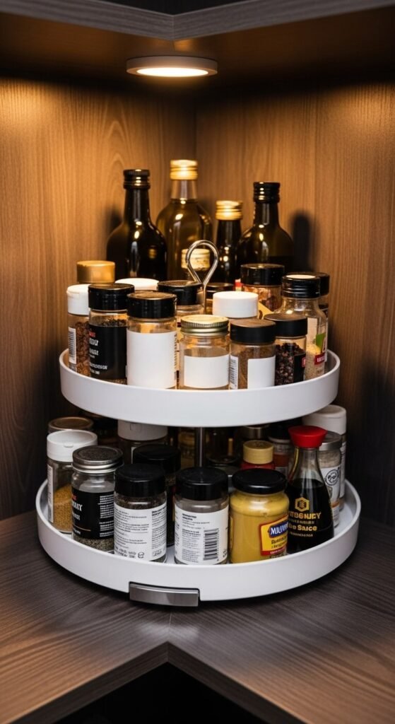 Corner shelves create dead zones where items disappear into darkness. A lazy susan solves this by bringing everything within reach with a simple spin. Use them for oils, vinegars, sauces, and condiments. You can buy plastic turntables for under five dollars at most home stores. For deep corners, try a two-tier lazy susan to double your storage. This hack works brilliantly for spices too—no more knocking over bottles to reach the one in back. Clean it monthly by removing items and wiping down the surface.
