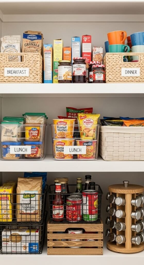 Group items by when you use them rather than by food category. Put breakfast foods together—oats, cereals, pancake mix, syrup. Dedicate another shelf to lunch supplies like crackers, nut butters, and canned soups. Keep dinner staples like pasta, rice, and sauces in their own zone. This method speeds up meal prep because everything you need lives in one spot. You won’t waste time searching multiple shelves for ingredients. Use small baskets or bins to keep each zone tidy and prevent items from migrating to other areas.