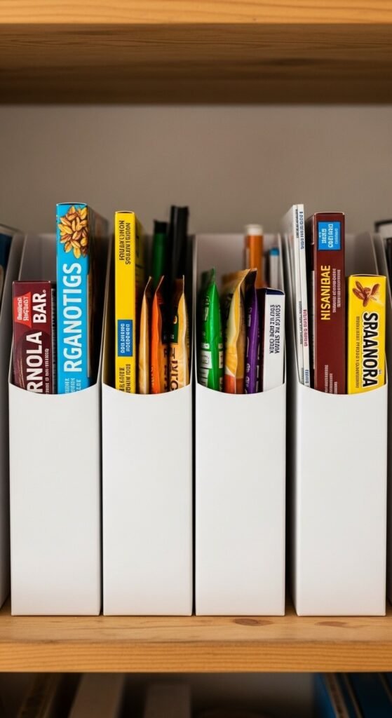 Flat boxes and packets flop over and create messy piles. Standing magazine holders keep them upright like files in a filing cabinet. Store granola bars, instant oatmeal packets, seasoning mixes, and tea boxes this way. You can see everything at once and grab what you want without disturbing the rest. Buy cardboard magazine holders for a dollar each or make your own from cereal boxes by cutting them at an angle. This hack works for cutting boards, baking sheets, and cooling racks too.