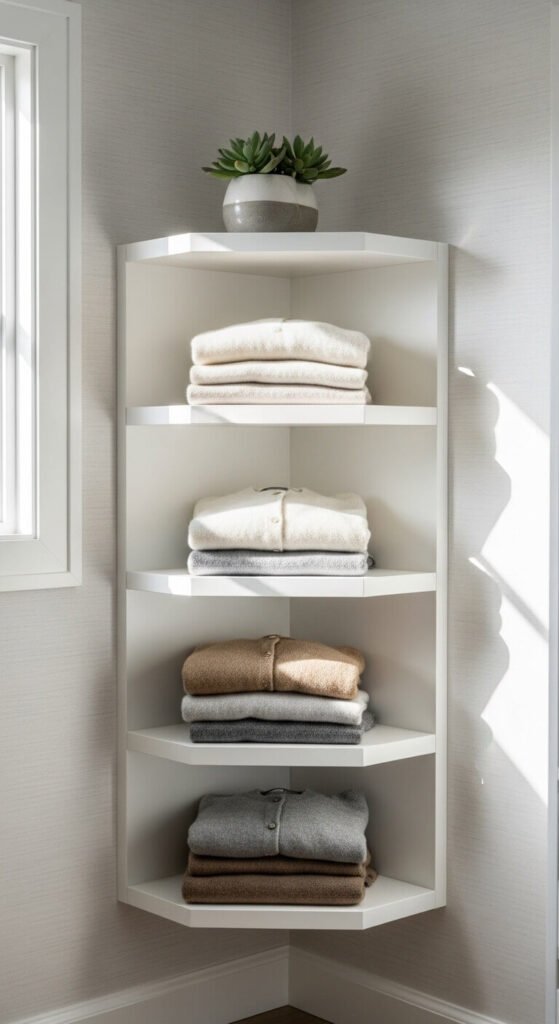 Corner space goes unused in most closets. Add floating shelves for $15-30 in materials. Cut triangular wood pieces or buy pre-made corner brackets.