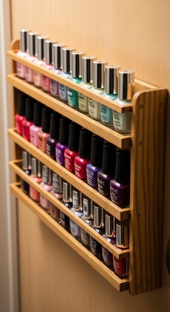 This trick works for makeup, perfume samples, or small accessories too. Paint racks to match your door color. Use multiple racks if you’re a polish collector.