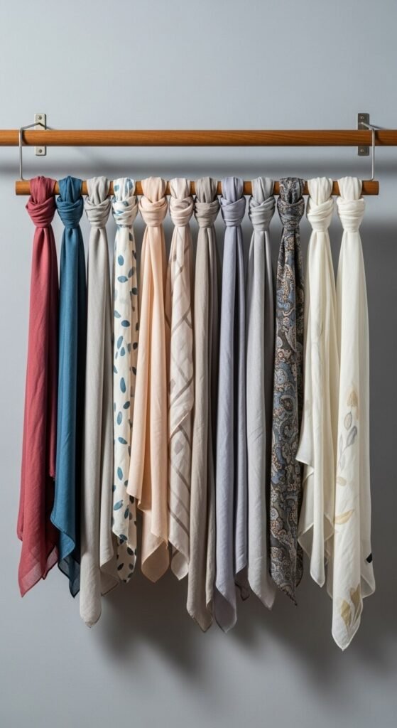 Install wooden dowel rods horizontally for scarf organization under $10. Use sturdy brackets spaced 3 feet apart.