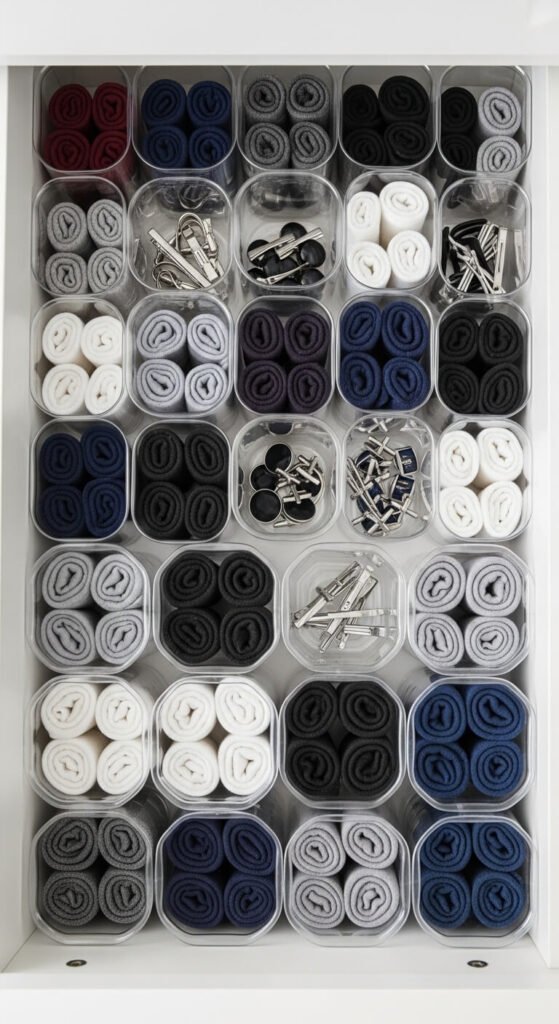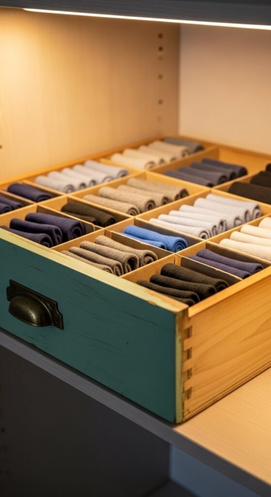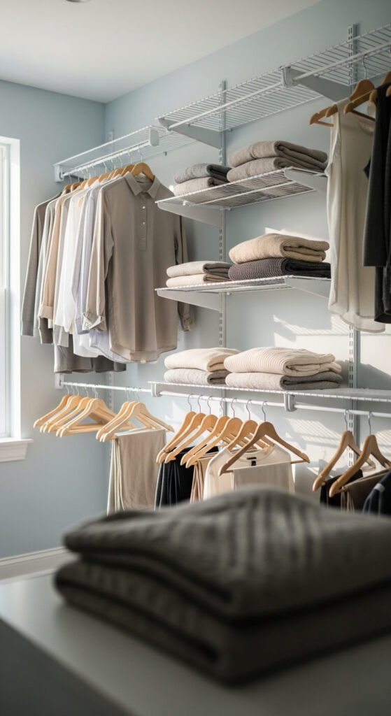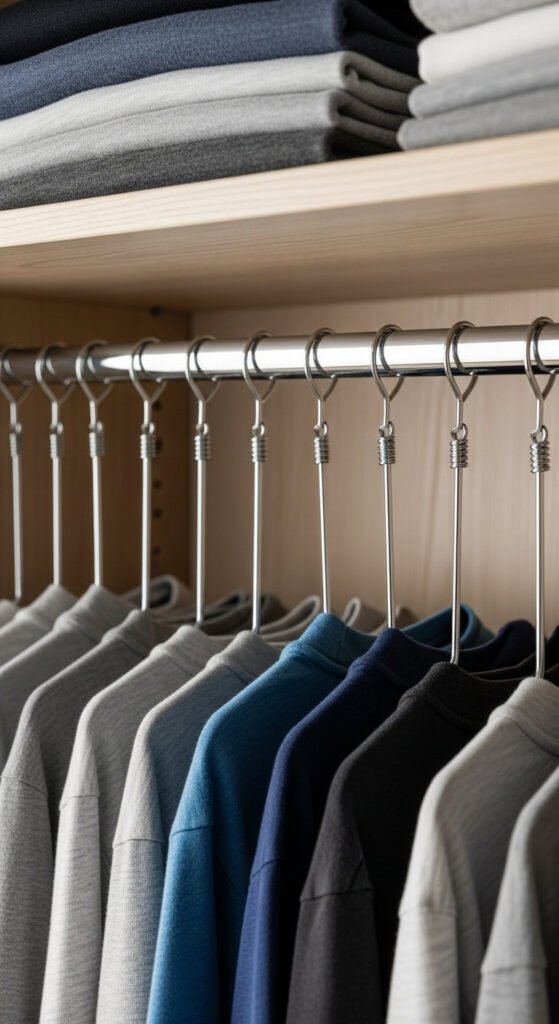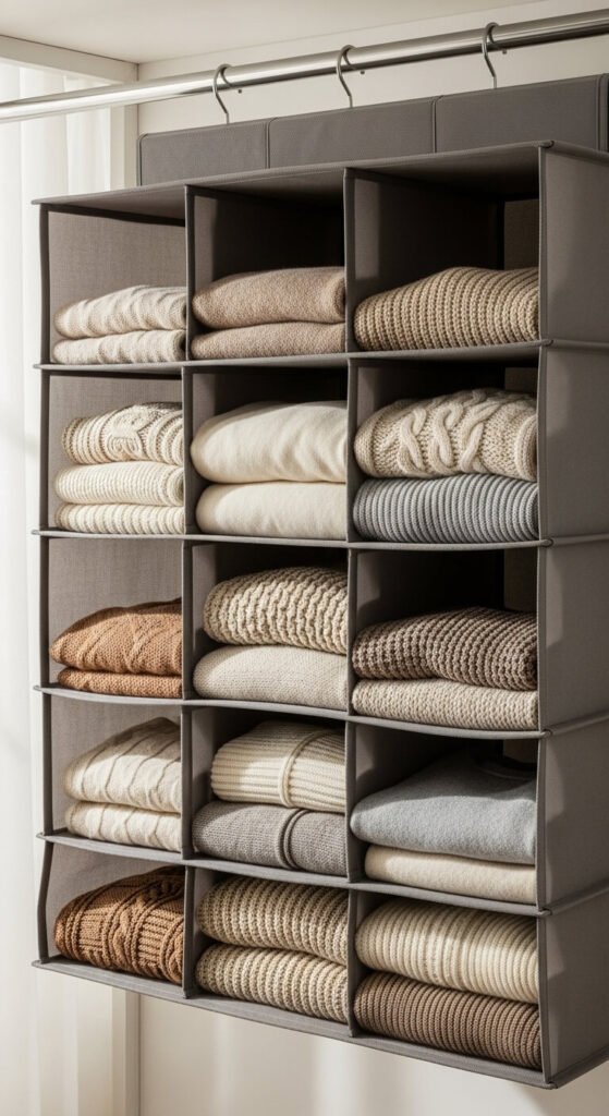 Store folded sweaters, t-shirts, or accessories in separate compartments. Keeps items wrinkle-free and visible. Takes advantage of vertical space above hanging clothes.