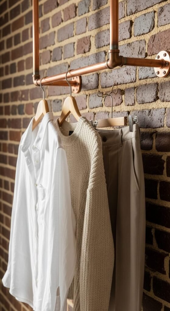 The warm copper tone adds modern industrial style. Supports heavy coats and dense hanging items. More durable than plastic alternatives.