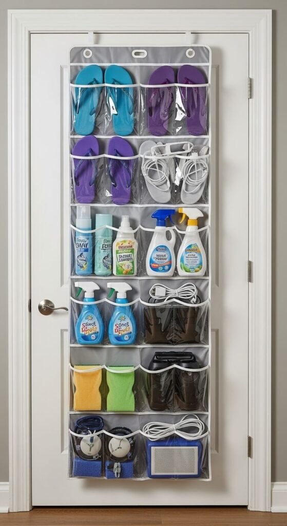 Clear pocket organizers cost $10-20 and hang over any door. Use for shoes or repurpose for accessories, cleaning supplies, or craft materials.