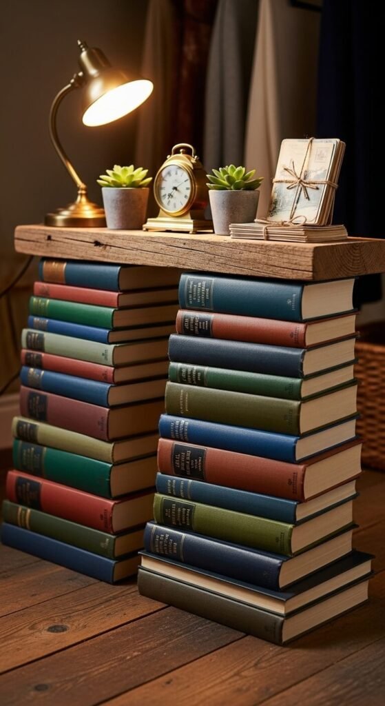 Stack sturdy hardcover books as shelf supports for a literary twist. Top with a wooden plank or acrylic sheet.