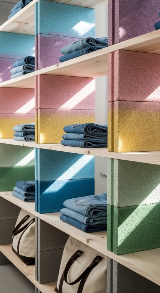 Spray paint blocks in fun colors before building. Stack in configurations matching your space. The industrial look suits modern closets.