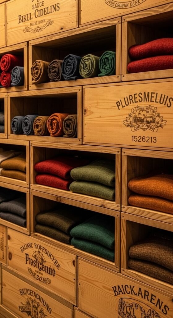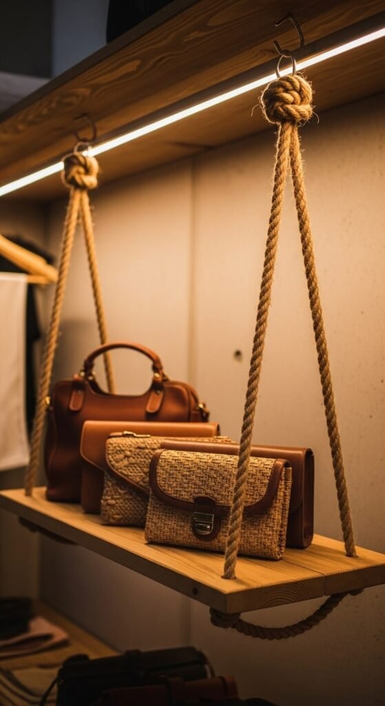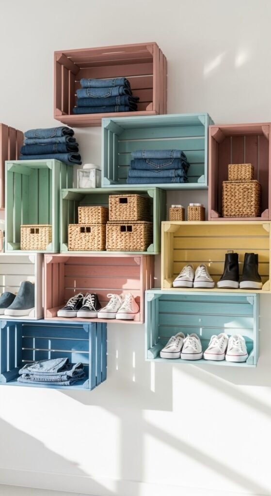 Stack crates for instant cubby storage. Leave some open for display. Add small baskets inside for accessories. The rustic look works in farmhouse or industrial-style closets. Find free crates behind grocery stores if you’re handy with sandpaper.