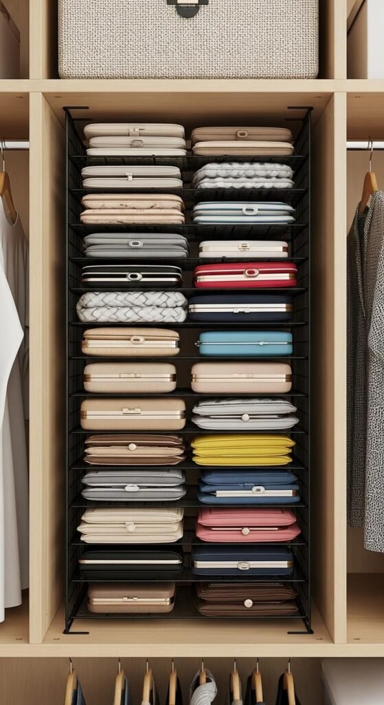 Desktop file organizers store clutches and small purses vertically. Buy metal or plastic versions for $5-10.