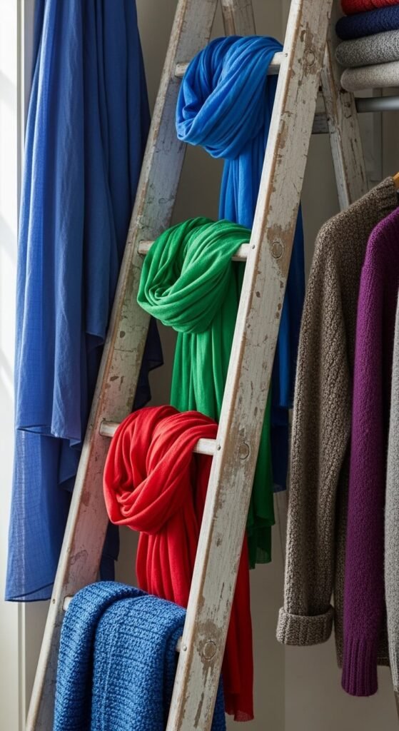 Sand and paint if the ladder needs refreshing. Apply polyurethane for protection. This adds height without taking floor space. Perfect for narrow closets where traditional shelving won’t fit.