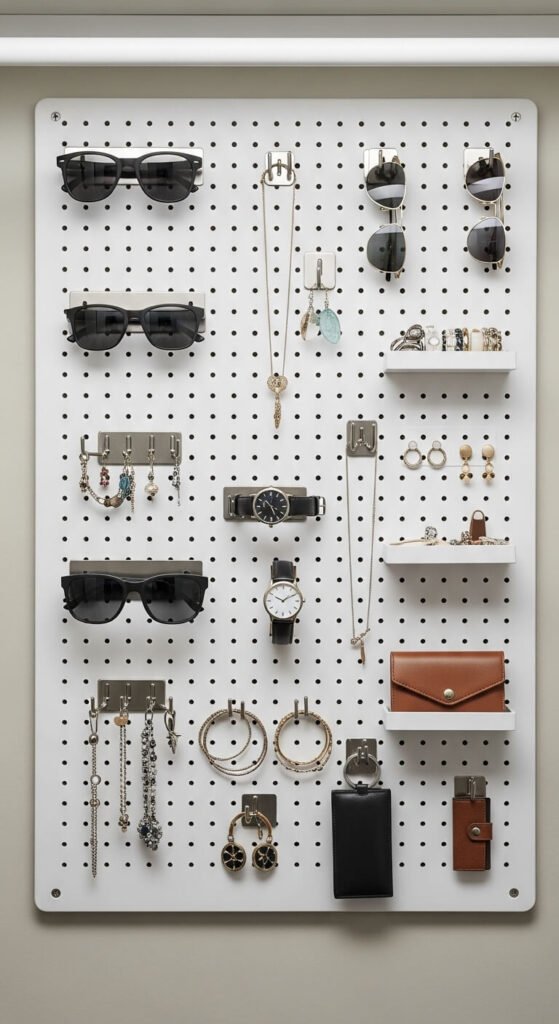 Frame the pegboard edges with trim for a finished appearance. This works inside closet doors too. Choose colored pegs for visual interest. Great for renters since holes are small and patchable.
